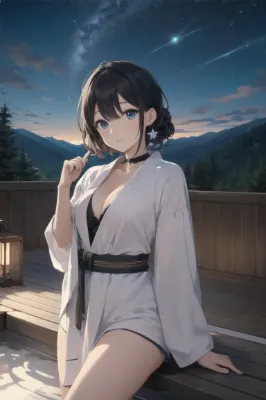 wife woman, 8k resolution, masterpiece, long sleeve, best quality, extremely fine and beautiful design, extremely fine and beautiful colors, amazing surprise, dynamic production, cinematic lighting, black hair, blue eyes, wife model, starry sky, night, onsen, hot springs, silent atmosphere, open-air bath, towel wrapped around body, comfortable expression, spectacular daytime mountain view, healing moment, mountain relaxation, scenery integration ,Beautiful starry night sky, miracle