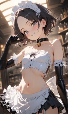 「年末振り返り第2弾はオレの衣装の変遷にゃ」 1、2枚目 初期の衣装 「最初はボンデージ風味強めのメイド服だにゃ。 中の人の趣味にゃw」 「衣装の構成はスカート、腰エプロン、トップス、ボレロ、グローブ、ガーターベルトにゃ。トップスとボレロの組み合わせで胸元を強調してるぞ。強調しすぎてよくR15送りになってたにゃw。この投稿も怪しいぞw。 グローブと袖のとこは、腕をチラ見せしているのがミソにゃ。いわば腕の絶対領域だにゃ。 足元はガーターベルトかサイハイソックスで絶対領域を作るにゃ。 全体的に黒基調にゃんだが、要所で肌見せして抜け感を演出してるぞ。」 「中の人こだわりの一品で、呪文も細かいんじゃが、初めて生成した時にはオレがめんどくさくなって全部脱ぐ、という奇跡(?)が起きたにゃw。それがオレのデビュー作にゃ。」 (光沢感に関してよく話題になるのですが、 厚手の生地は"Patent leather"、 薄手の生地は"latex"を ところどころで"silky"を使ってます。 モデルによると思いますが、素材を指定した方が質感が出やすい印象ですね。) 3枚目 コルセット付き 「コルセットつけてゴスロリ感出した衣装だにゃ。細かい指定が甘かったみたいで、ちょっと生成が安定しなかったにゃ。」 4枚目 スタンプ用 「スタンプで映えるようにアレンジした衣装にゃ。 絵が暗くならないよう、ノースリーブとショートグローブにして腕を出すようにしたにゃ。逆に胸元は出さずに腕とワキに目が行くようにしたぞ。髪にピンクのカラーをいれはじめたのもこのタイミングにゃ。」 5枚目 『海の家』用 「夏場に海の家やってた時の水着風衣装だにゃ。 谷間はあまり出ないように工夫したんで、意外にR指定回避してたにゃ。衣装より髪型の方が手こずって、思い通りになるまでかなり試行錯誤したにゃ。」 6枚目 現在のメイン衣装 「コラボでみんなに着せまくってる衣装だにゃ❤︎ うちのメンバーも全員着てるにゃ。海の家版をベースにグローブとストッキングを追加、スカートをはプリーツにしてスタイリッシュに決めたにゃ。髪型もツーサイドアップにしてイメチェンにゃ。」 7枚目 正統派? 「主に龍くんとモブ子が着ている衣装だにゃ。 オレもたまに着てるぞ。 呪文的にはビクトリア朝風のメイド服にゃんだが、袖とスカートのすそを短くして可愛さをアピールしてるにゃ。」 「あと和風メイドもあるが、今んとこまろ専用でオレは着てないから今回は割愛にゃ」 (というところで、今回はここまでですね。) 「そろそろお題に戻るかにゃー。クリスマスと新年の絵も作りたいしにゃー。予算はどうにゃ?」 (自転車操業です(汗))