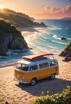 beach, Campervan, seaside, Fine Wines, Delicious Food, Jace Tree, People with open hearts and fun, Beautiful Coastline, Sunset, Quality Best, 4K, 8k, High Resolution, masterpiece:1.2, super detailed, Actual, photo-Actual:1.37, cinematic lighting, Depth of Field, Anatomically Correct, extremely fine and beautiful design, extremely fine and beautiful colors, amazing, high resolution, <lora:saturation:1>, <lora:make25d_type4_v100:1>, shadow