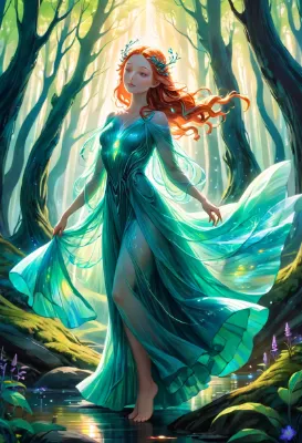water fairy, ethereal, mystical, elegant, flowing blue dress, transparent wings, surrounded by shimmering droplets, magical aura, sparkling in sunlight, fantasy creature, enchanting, high-quality details, high-resolution output.