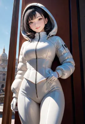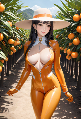 (photorealistic:1.4), (RAW photo), masterpiece, best quality, extremely detailed, lady, neat and clean, shy, black long hair, ponytail, almond eyes, smile, (shiny orange down jacket:1.2), blazer, gloves, ribbon bow tie, pleated skirt, long boots, restaurant, mandarin orange, peeling