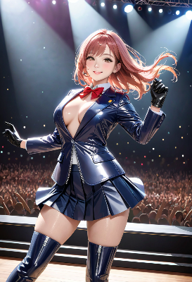 (photorealistic:1.4), (RAW photo), masterpiece, best quality, extremely detailed, lady, (shiny down jacket:1.4), (mini skirt, leather boots, long gloves:1.2), almond shaped eyes, smile, staring, dark brown long hair, <lora:hime_style-1.0r8:0.8>