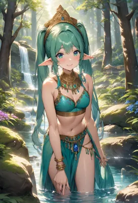 masterpiece, best quality, extremely detailed, anime, girl, Hatsune Miku, VOCALOID, blue-green long twintails, frilly skirt, gothic lolita fashion, beautiful girl, sparkling morning dew in the sunlight, flower field, colorful butterflies flying, smiling fairy girl, rainbow, blue sky, sparkling bubbles, fantastic, elf