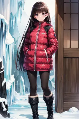 (photorealistic:1.4), (RAW photo), masterpiece, best quality, extremely detailed, lady, neat and clean, elegant, shy, black long hair, almond eyes, smile, white down coat, enamel knee high boots, rubber suit, town, street, flowers and trees, early spring, cold day