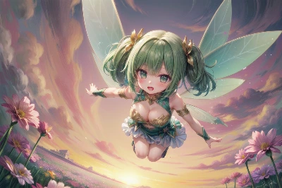 (best quarity:1.5), ultra high resolution, (extremely detailed), 8K, masterpiece, (outlined vector graphics, chromatic aberration), (perfect anatomy), (3 girls, multiple girl:1.4), 20 years old, beautiful girl, (fairy, chibi:1.6, line up), huge breasts, adult, sexy, (light green hair, short twintails), (translucent gold gown, fairy feathers), (flying above many flowers:1.6), (laughing, open mouth, grassland, outdoor, sunset), blush, white skin, (super fine illustration, photorealistic, depth of field), <lora:hairdetailer:0.8>