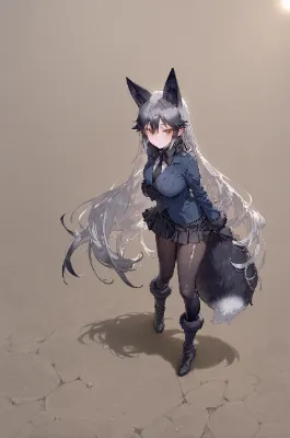 white coat, black bowtie,black ribbon, black shirt, frills, fur collar, white fur,black gloves, frilled sleeves, long sleeves, white pleated skirt, black pantyhose, black footwear, black shoes, <lora:black_headed_ibis:0.9>,