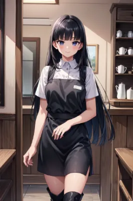 (photorealistic:1.4), (RAW photo), masterpiece, best quality, extremely detailed, lady, cafe clerk, waitress, white blouse, black leather tight skirt, knee length boots, (enamel rubber gloves:1.2), almond shaped drooping eyes, smile, staring, black long hair, <lora:hime_style-1.0r8:0.8>