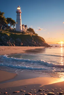 beach, Campervan, seaside, Fine Wines, Delicious Food, Jace Tree, People with open hearts and fun, Beautiful Coastline, Sunset, Quality Best, 4K, 8k, High Resolution, masterpiece:1.2, super detailed, Actual, photo-Actual:1.37, cinematic lighting, Depth of Field, Anatomically Correct, extremely fine and beautiful design, extremely fine and beautiful colors, amazing, high resolution, In the distance there stood a dimly white lighthouse, 灯台, <lora:saturation:1>, <lora:make25d_type4_v100:1>
