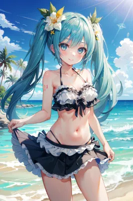 masterpiece, best quality, extremely detailed, anime, girl, skirt, Hatsune Miku, VOCALOID, blue-green long twintails, girl, white lighthouse, white sandy beach, tropical flowers blooming, blue sky, blue sea, beach, summer, cute striped bikini-clad beauty, cute smile
