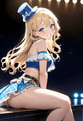 1girl, solo, blonde hair wavy hair long hair, blue eyes, open smile, blue skirt suspender skirt musical note pattern skirt, petticoat, frilled blouse, white stockings bow stockings, beret with ribbon, walking in park, leaning forward, hand on chin, looking at viewer, masterpiece, best quality, very aesthetic, highly detailed, high resolution, amazing quality, absurdres,scenery,