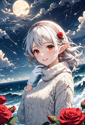8K,((masterpiece,best quality,Ultra extremely detailed,perfect anatomy,detailed,high-resolution,highres,extremely detailed,perfect 5+fingers:1.5,sharp focus:1.5,),(high-contrast:1.6,strong back-light,close-up face,from-above:1.6,rose Flowers print,girl elf wearing glossy jewelry decoration sweater with sparkle reflected light,knit woolen white gloves,knit head band,knit short-skirt,cute tights,long knit,scarf)),looking at viewer:1.5, (extra detailed red Eyes with reflection), waving shining long white hair_with curly,elf ear with big earrings,smile,blush,lipstick,full fresh lips,wet-lip,big hip,small breasts,soft wind,throw-out-her-chest:1.5,armpit,BREAK,((wave)),strong waving sea,shooting stars, round many stars, birds,city in the distance,dark cloud, big white roses , <lora:hairdetailer:1> <lora:make25d_type1_v100:1>,,