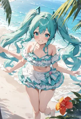 anime, masterpiece, best quality, extremely detailed, girl, white sandy beach, tropical flowers blooming, blue sky, waves lapping at the shore, crystal blue sea with white foamy waves, summer, Hatsune Miku, VOCALOID, long twin tails in blue-green, frilly mini skirt, cute girl in colorful frilly bikini, cute smile