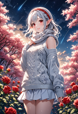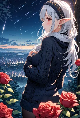 8K,((masterpiece,best quality,Ultra extremely detailed,perfect anatomy,detailed,high-resolution,highres,extremely detailed,perfect 5+fingers:1.5,sharp focus:1.5,),(high-contrast:1.6,strong back-light,close-up face,from-back,rose Flowers print,girl elf wearing glossy jewelry decoration sweater with sparkle reflected light,knit woolen mitten,knit head band,knit short-skirt,cute tights,long knit,scarf)),looking at viewer:1.5, (extra detailed red Eyes with reflection), waving shining long white hair_with curly,elf ear with big earrings,smile,blush,lipstick,full fresh lips,wet-lip,big hip,small breasts,soft wind,throw-out-her-chest:1.5,armpit,BREAK,forest,shooting stars, round many stars, birds,city in the distance,dark cloud, big white roses , <lora:hairdetailer:1> <lora:make25d_type1_v100:1>,,,,,
