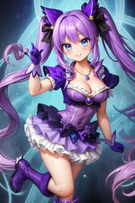 masterpiece, best quality, beautiful, ultra detailed, hyper extreme detailed, anime, 1girl, (beautiful), (medium breasts, cleavage), necklace, (pretty blue and purple magical girl costume:1.4), (lace mesh long gloves), (long boots), (long purple hair, twin tails), (blue eyes), Frills like a skirt at the waist, (cute magical girl), (cute smile), (lie on own back, overhead shot), (spread arms), (spread legs), (female ejaculation), (nose blush), (best smile to you dear:1.3), <lora:sensualface_type2:1> <lora:flat2:-1>