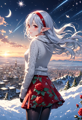 8K,((masterpiece,best quality,Ultra extremely detailed,perfect anatomy,detailed,high-resolution,highres,extremely detailed,perfect 5+fingers:1.5,sharp focus:1.5,),(high-contrast:1.6,strong back-light,close-up face,from-back,rose Flowers print,girl elf wearing glossy jewelry decoration sweater with sparkle reflected light,knit woolen mitten,knit head band,knit short-skirt,cute tights,long knit,scarf)),looking at viewer:1.5, (extra detailed red Eyes with reflection), waving shining long white hair_with curly,elf ear with big earrings,smile,blush,lipstick,full fresh lips,wet-lip,big hip,small breasts,soft wind,throw-out-her-chest:1.5,armpit,BREAK,snow, palaza of snow,shooting stars, round many stars, birds,city in the distance,dark cloud, big white roses , <lora:hairdetailer:1> <lora:make25d_type1_v100:1>,,,,,,,