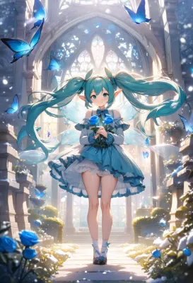 masterpiece, best quality, extremely detailed, anime, girl, Hatsune Miku, VOCALOID, blue-green long twintails, skirt, pink frilly gothic lolita dress, transparent blue fairy girl with wings, beautiful, cute, smiling, pink roses blooming garden, sparkling white snow in sunlight, snowflakes, elf, blue butterflies, magic, mysterious, fantasy, snow covered