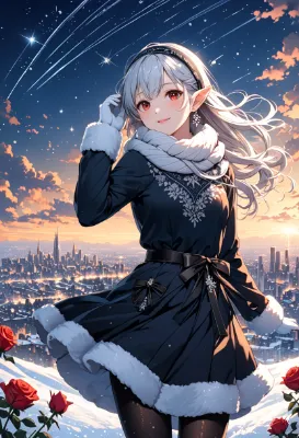 8K,((masterpiece,best quality,Ultra extremely detailed,perfect anatomy,detailed,high-resolution,highres,extremely detailed,perfect 5+fingers:1.5,sharp focus:1.5,),(high-contrast:1.6,strong back-light,close-up face,from-back,rose Flowers print,girl elf wearing glossy jewelry decoration sweater with sparkle reflected light,knit woolen mitten,knit head band,knit short-skirt,cute tights,long knit,scarf)),looking at viewer:1.5, (extra detailed red Eyes with reflection), waving shining long white hair_with curly,elf ear with big earrings,smile,open mouth,blush,lipstick,full fresh lips,wet-lip,big hip,small breasts,soft wind,throw-out-her-chest:1.5,armpit,BREAK,snow, palaza of snow,shooting stars, round many stars, birds,city in the distance,dark cloud, big white roses , <lora:hairdetailer:1> <lora:make25d_type1_v100:1>,