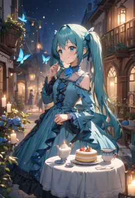masterpiece, best quality, extremely detailed, anime, girl, Hatsune Miku, VOCALOID, blue and green long twintails, skirt, blue eyes, fairy girl with blue transparent wings wearing a pink frilly gothic lolita outfit, cute, smiling, elf, beautiful girl, night forest, tea time in a pink rose blooming garden, tea and cake on the table, candle flames flickering and shining fantastically, butterflies flying