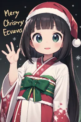 12 years old girl, fairy kissing girl’s cheek, very longest black hair with flowing straight hair, hair ribbon with mintgreen stripe, black eyes, flat chest, straight across bangs, princess cut, very long sideburn, head, drooping eyes, cute, meekness, bob cut, long back hair,present get presents from Santa in sacks