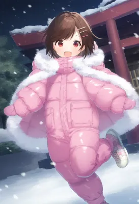 down jacket, snowsuit, long stitched padded puffy pants, {{{long puffy fur-trimmed cape}}}, heavy clothes, fur-trimmed sleeves, fur-trimmed cuffs, fur-trimmed hood, oversized clothes, shiny clothes, cute girl, solo, sneakers, contrapposto, mittens, loli, outdoors, , rating:general, amazing quality, very aesthetic, absurdres