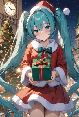 masterpiece, best quality, extremely detailed, anime, girl,初音ミク,VOCALOID,ブルーグリーンのロングツインテール,スカート,青い瞳,雪が降る街で赤いフリルのゴスロリなドレスを着てプレゼントボックスをもった女の子,可愛い,笑顔,美少女,胸元で輝く赤い宝石,時計塔,雪の結晶,クリスマスツリー,神秘的