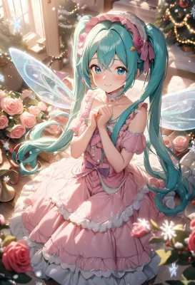 masterpiece, best quality, extremely detailed, anime, girl, Hatsune Miku, VOCALOID, blue-green long twintails, skirt, blue eyes, cute smiling fairy with pink frilly gothic lolita dress, transparent blue wings, girl, beautiful girl, pink roses blooming garden, soft sunlight shining down with sparkling droplets on rose flowers, mysterious, fantastical, gift box