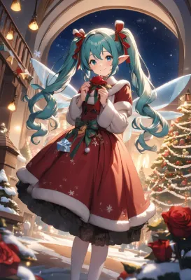 masterpiece, best quality, extremely detailed, anime, girl, Hatsune Miku, VOCALOID, blue-green long twintails, skirt, blue eyes, yellow frilly lolita-style dress, transparent blue-winged fairy, fairy, beautiful girl, cute, smiling, elf, yellow roses blooming in a garden, snowflake, Christmas Eve, mysterious, fantastical, holy night, starry sky, snow