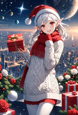 8K,((masterpiece,best quality,Ultra extremely detailed,perfect anatomy,detailed,high-resolution,highres,extremely detailed,perfect 5+fingers:1.5,sharp focus:1.5,),(high-contrast:1.6,strong back-light,close-up face,from-back,rose Flowers print,girl elf wearing glossy jewelry decoration sweater with sparkle reflected light,knit woolen mitten,knit head band,knit short-skirt,cute tights,long knit,scarf)),looking at viewer:1.5, (extra detailed red Eyes with reflection), waving shining long white hair_with curly,elf ear with big earrings,smile,open mouth,blush,lipstick,full fresh lips,wet-lip,big hip,small breasts,soft wind,throw-out-her-chest:1.5,armpit,with presents,BREAK,christmas eve, big bells,gifts,shooting stars, round many stars, birds,city in the distance,dark cloud, big white roses ,planets, <lora:hairdetailer:1> <lora:make25d_type1_v100:1>,,,,,