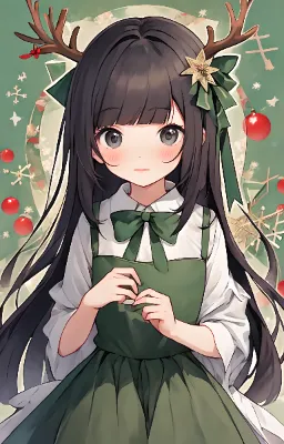 12 years old, young girl, very long black hair, straight hair with a mint green stripe, black eyes, flat chest, straight across bangs, princess cut, very long sideburns, round head with drooping eyes, cute and meek expression, bob cut with long back hair, wearing a kimono, smiling,1 girl,Christmas,reindeer,Horn Head,santa sack