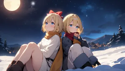2girls,(blonde hair, blue eyes:1.2),short bob cut,(hair bow:1.5),red bow,black long hair,(santa costume:1.3),red dress,white fur trim,black boots,santa hat,(carrying large white sack:1.2),standing pose,playful expression,(mischievous smile:1.3),christmas atmosphere,twinkling lights,winter night,snowy scene,festive decorations,(christmas mood:1.2),holding gift sack together,excited pose,standing side by side,masterpiece,best quality,(very aesthetic:1.3),absurdres,