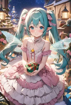masterpiece, best quality, extremely detailed, anime, girl, Hatsune Miku, VOCALOID, long twin tails in blue-green, skirt, blue eyes, fairy with transparent blue wings in a red frilly gothic lolita dress with sparkling yellow jewel at the chest, girl, beautiful, cute, smiling, elf, garden with blooming red roses, snowflake, Christmas, mysterious, fantastical, holy night, snow, starry sky, present