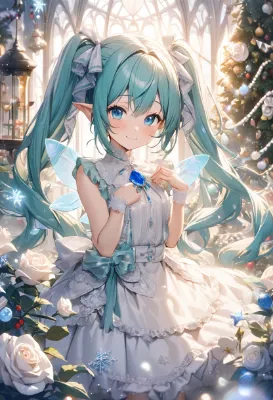 masterpiece, best quality, extremely detailed, anime, girl, Hatsune Miku, VOCALOID, blue-green long twintails, skirt, blue eyes, pink frilly gothic lolita dress-wearing fairy with clear blue transparent wings, sparkling yellow gem at the chest, cute girl, beautiful, smiling, elf, pink rose garden, paradise, snowflake, Christmas, mysterious, fantastical, holy night, snow, starry sky, present