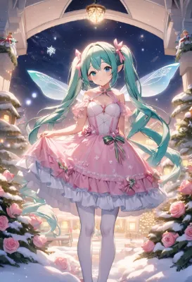 masterpiece, best quality, extremely detailed, anime, girl, Hatsune Miku, VOCALOID, blue-green long twintails, skirt, blue eyes, fairy with clear blue transparent wings in a pure white frilly Gothic Lolita style dress, sparkling blue gem at the neckline, girl, beautiful, cute, smile, elf, white roses blooming garden, paradise, snowflakes, Christmas, mysterious, fantastical, holy night, snow, starry sky, presents