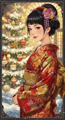 Fantasy anime-style illustration of a bipedal kawaii female cat with elegant long white fur, wearing a Santa dress. She is happily eating a cream and strawberry cake. The setting is a cozy brick interior with a fireplace and a Christmas tree. The focus is on her upper body, capturing her satisfied expression. Vibrant colors, smooth textures, and intricate details create a serene yet adventurous atmosphere.