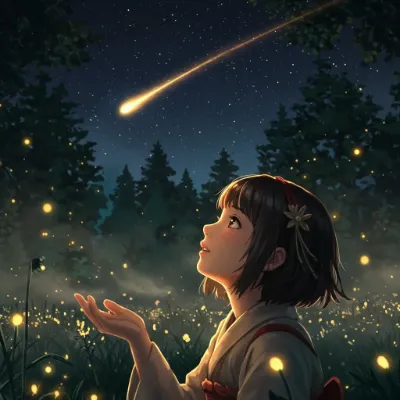 A fantasy anime-style illustration of the upper body of an adorable bipedal female cat traveler standing on a train platform. The background features a magical village on an alien planet with a star-traveling steam locomotive in the distance. Warm and dreamy atmosphere, night sky full of stars, high resolution (4K).