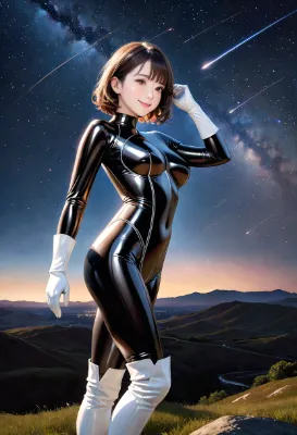 (photorealistic:1.4), (RAW photo), masterpiece, best quality, extremely detailed, lady, (maid:1.1), neat and clean, elegant, black long hair, almond eyes, smile, (shiny, glossy, tight, down jacket:1.2), rubber corset, knee high boots, white brim, apron, lounge, milk tea, relaxed, (wide window, starry night, twinkle stars:1.1)