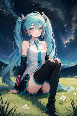 masterpiece, best quality, extremely detailed, anime, girl, Hatsune Miku, VOCALOID, long twintails in blue-green, skirt, blue eyes, fairy girl with a blue frilly gothic Lolita dress on top of a hill in a night grassy field admiring a starry sky, transparent blue wings, blue roses blooming, blue butterflies flying, shooting star, beautiful girl, smiling, cute, fantastical, mystical