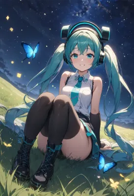 masterpiece, best quality, extremely detailed, anime, girl, Hatsune Miku, VOCALOID, blue-green long twintails, skirt, blue eyes, sparkling red gem pendant at the chest, fairy girl in a pink frilly gothic Lolita dress on a hill on a grassy meadow under a starry night sky, clear blue transparent wings, cute smile, pink roses blooming, fantastical, mysterious, blue butterflies flying