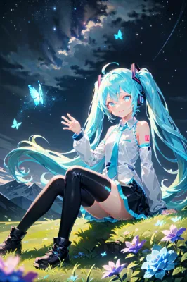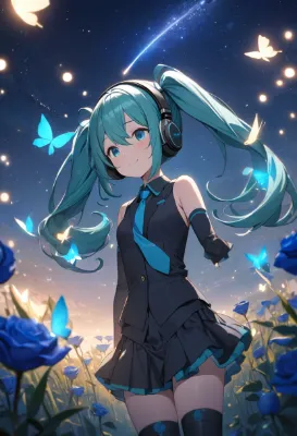 masterpiece, best quality, extremely detailed, anime, girl, 初音ミク, VOCALOID, blue-green long twintails, skirt, blue eyes, sparkling red gemstone pendant on chest, fairy girl in pink frilly gothic lolita dress on a hill in a night grassy meadow under a starry sky, transparent blue wings, smiling, cute, pink roses blooming, fantastical, mysterious, blue glowing butterflies flying