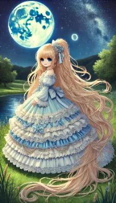 プロンプト: 「1人のとても小柄な女性。とても背の低く、とても長く明るい金髪、とても長くまっすぐ流れるようなストレートヘア。身長はとても低く、パステルピンク色のフリルブラウスを着ている。白色のロングスカートにはたっぷりとフリルが幾重にも重なり、白色のロングスカートは多くのフリルとレースで豪華に飾られている。ロングスカートの裾やウエスト部分にもフリルとレースの装飾が豪華に施されて、裾まで華やかに広がっている。首元には白色のリボンをつけている。ウエストに白色のリボンをつけている。非常に小柄で可愛く、非常に低い背であり、顔を赤くして笑顔を浮かべていている。非常に長く明るい金髪のストレートヘアが広がっている。青い目。湖畔の草原に立っている。時刻は夜、月と天の川。とても背が低い。とても小柄な姿を後ろから見た絵。全体がアニメ風に描かれ、非常に詳細な描写。アスペクト比は縦長」の絵を描いて