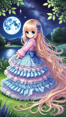 プロンプト: 「1人のとても小柄な女性。とても背の低く、とても長く明るい金髪、とても長くまっすぐ流れるようなストレートヘア。身長はとても低く、水色のフリルブラウスを着ている。白色のロングスカートにはたっぷりとフリルが幾重にも重なり、白色のロングスカートは多くのフリルとレースで豪華に飾られている。ロングスカートの裾やウエスト部分にもフリルとレースの装飾が豪華に施されて、裾まで華やかに広がっている。首元には白色のリボンをつけている。ウエストに白色のリボンをつけている。非常に小柄で可愛く、非常に低い背であり、顔を赤くして笑顔を浮かべていている。非常に長く明るい金髪のストレートヘアが広がっている。青い目。湖畔の草原に立っている。時刻は夜、月と天の川。とても背が低い。とても小柄な姿を後ろから見た絵。全体がアニメ風に描かれ、非常に詳細な描写。アスペクト比は縦長」の絵を描いて