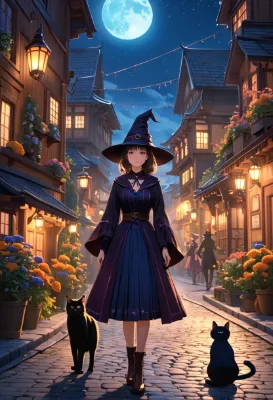 high resolution, masterpiece, extremely detailed, amazing surprise, one woman, wearing dafful coat, long hair, black hair, blue eyes, buddy ginger cat, walking, path, fantasy, dynamic production, cinematic lighting, fun, fun walking, image, morning, clear sky, 8k, 楽しい散歩,夜道 <lora:saturation:1> <lora:make25d_type1_v100:1>