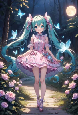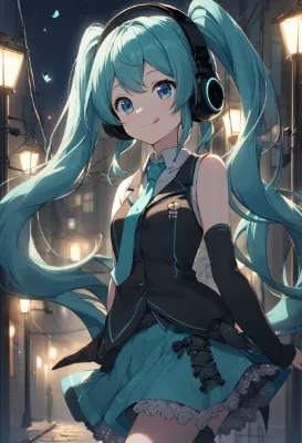 detailed anime girl, Hatsune Miku, VOCALOID, blue-green long twintails, skirt, necktie, headphones, sleeveless, black arm covers, black long boots, girl, blue eyes, dark night street, light of streetlights on telegraph poles, beautiful girl, innocent smile with tongue out, cute, butterflies