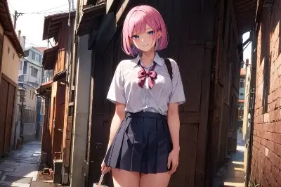 (absurdres),(masterpiece), (best quality), (ultra detailed), (highres), (illustration:1.4), (detailed face:1.3), (highlights in eyes:1.3)(detailed hair:1.3), (detailed skin:1.3),photorealistic, realistic,BREAK 1girl,14yo,kawaii,(short hair, bob cut, dark pink hair,Blue inner hair,beautiful detailed hair ),(blue eyes),faint lips,happy smile,medium breasts,dynmic angle ,mountain climbing,A rainbow appears,shine,BREAK ,backpack,(sweat),rainbow:1.3, <lora:flat2:-0.2>,summer,mountain top, simple beige safari cap, mountaineering jacket, black short pants, leggings under shorts, (black backpack), from back,Big waterfall in front,