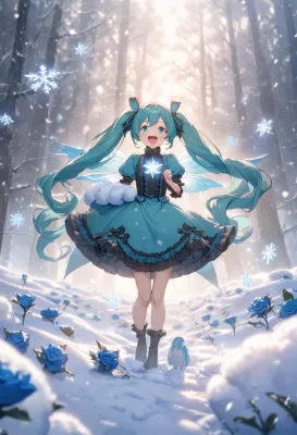 masterpiece, best quality, extremely detailed, anime, girl, Hatsune Miku, VOCALOID, blue-green long twin tails, blue eyes, girl, skirt, fairy girl with blue fluffy gothic dress and clear blue wings, beautiful, cute, smiling innocently with a lolipop candy sticking out her tongue, snowfield, blizzard, powder snow, snowflake, fantastical, mysterious, snow fairy, magic, fantasy