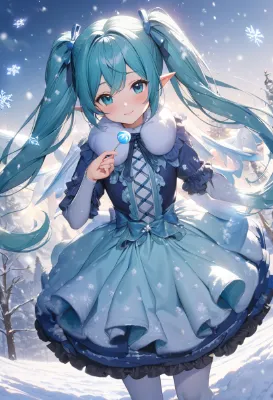 masterpiece, best quality, extremely detailed, anime, girl, Hatsune Miku, VOCALOID, blue-green long twintails, blue eyes, girl, snowy back alley of a city, old brick wall, elf girl in jeans and leather jacket, beautiful, cute, smiling, blizzard, sparkling diamond dust, powder snow