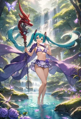 masterpiece, best quality, extremely detailed, anime, girl, Hatsune Miku, VOCALOID, blue-green long twintails, blue eyes, skirt, purple cape and dress with a dragon wand, beautiful, cute, smiling innocently with tongue out, sunlit sanctuary in a forest with purple roses blooming, butterflies flying, temple, waterfall, stream, mysterious, fantastical, purple-eyed blue dragon