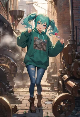 masterpiece, best quality, extremely detailed, anime, girl, Hatsune Miku, VOCALOID, long twintails in blue-green, blue eyes, girl in hooded parka with jeans, beautiful, cute, smiling innocently with tongue out holding a candy, old brick wall, alley, punk