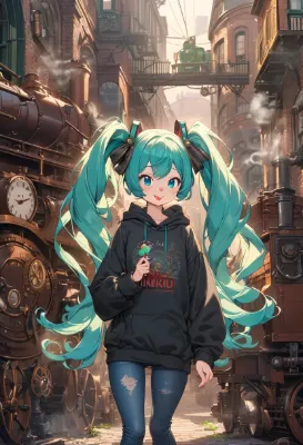 masterpiece, best quality, extremely detailed, anime, girl, Hatsune Miku, VOCALOID, long twintails in blue-green, blue eyes, neon lights shining in a dazzling night city, girl in black hoodie with jeans, cute, beautiful, smiling innocently with candy in hand, punk