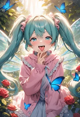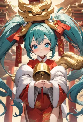 masterpiece, best quality, extremely detailed, anime, girl, Hatsune Miku, VOCALOID, blue-green long twintails, blue eyes, girl in a red kimono ringing the temple bell on New Year's Eve, beautiful, cute, smiling, temple bell, kadomatsu
